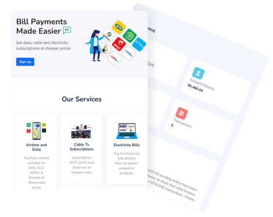 Everything on your website will be automated and integrated with our API. All you'd have to do is fund your wallet with us and your customers can purchase data/airtime from your website.